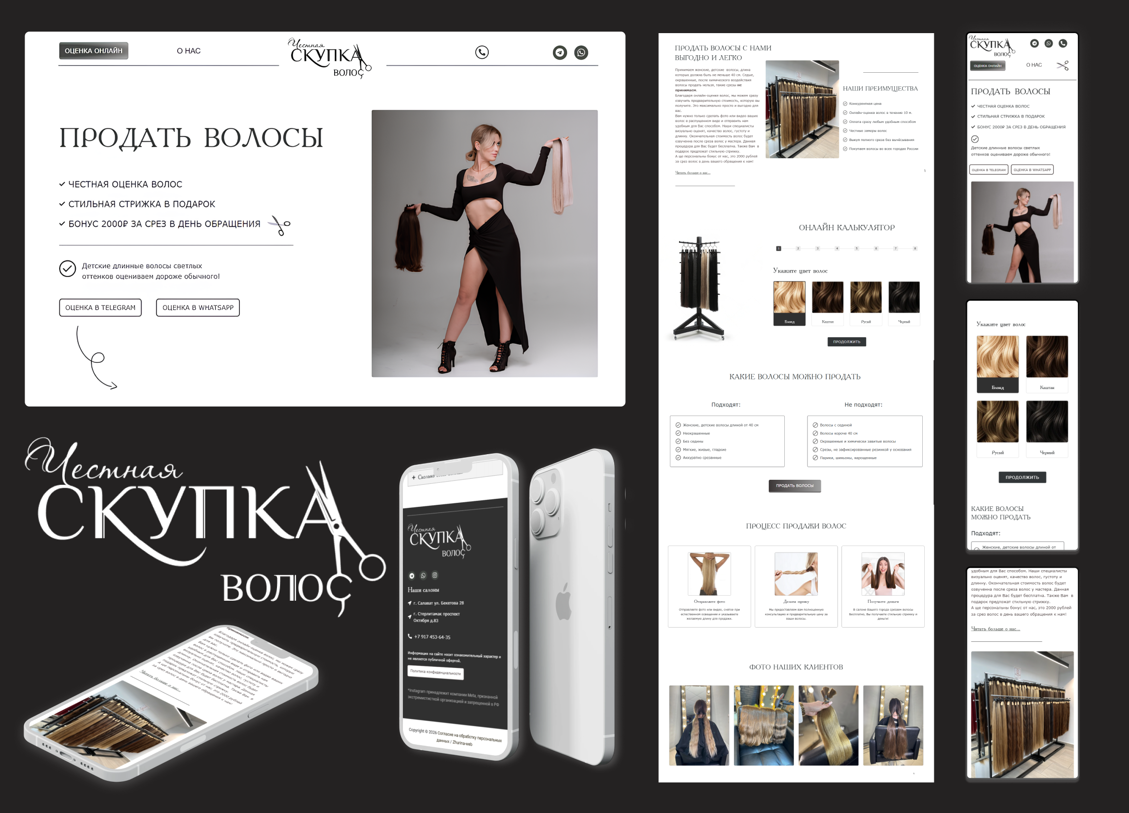 Разработка сайта-визитки для услуг по скупке волос. - Уникальный дизайн в чистом минималистическом стиле. - Дизайн логотипа - Верстка дизайна с Figma на CMS WordPress